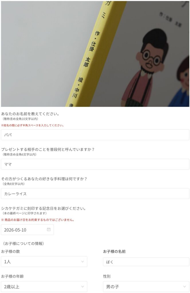 贈り主や相手の呼び名など、絵本の土台となる基本情報を入力します。