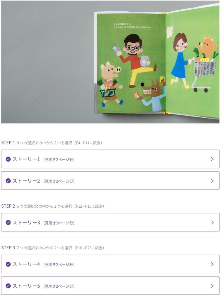 用意された複数のストーリー案(選択文)の中から、自分の気持ちに最も近いものを選びます。また、タッチの異なる複数のプロ絵本作家の中から、自分好みのイラストを選択できるのも大きな特徴です。