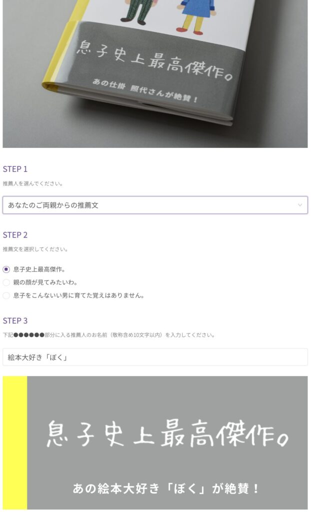 本の実感を高める「帯」のデザインを選びます。家族や友人からの推薦文風など、ユーモア溢れる多様な選択肢が用意されています